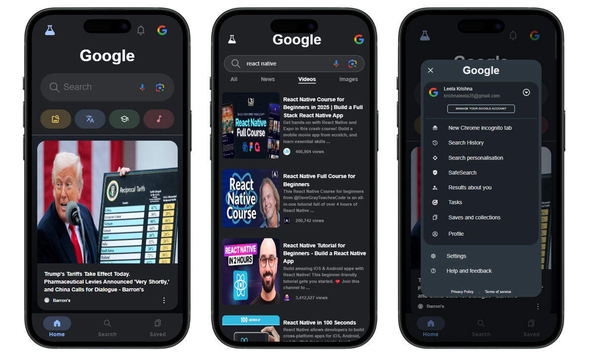 A fully responsive Google Search Clone built using React.js, Capacitor js mimicking the core functionality and minimalist design of the original Google search engine. Integrated with the Google Custom Search API to fetch real-time search results. Features include a functional search bar, search results with links, snippet previews, and google listen, google lens. Designed with clean UI and optimized for performance and user experience.